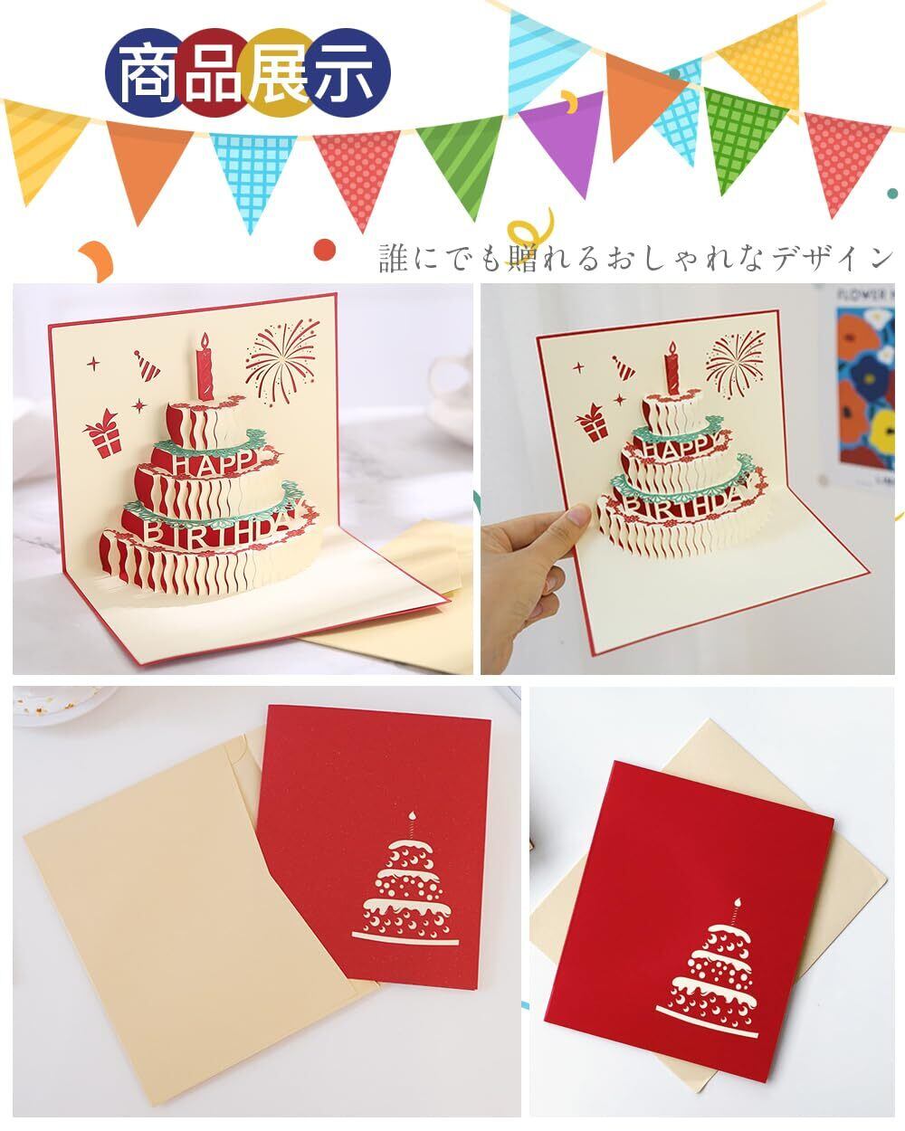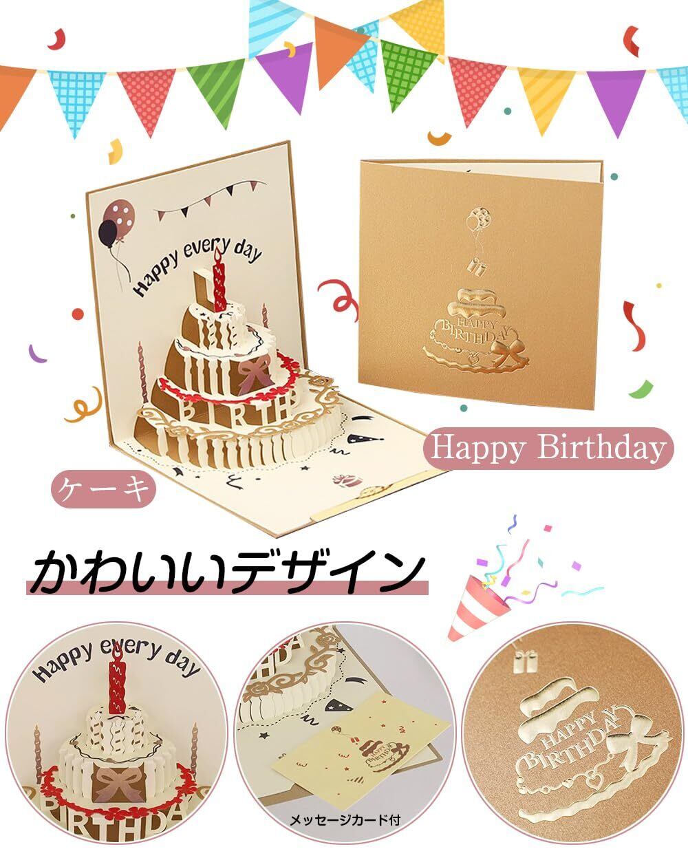 カードを開くと立体的にバースデーケーキや「Happy Birthday」の文字が飛び出します。カラフルで華やかなデザインで、贈る相手に合った自分らしいカードを選ぶことができます。