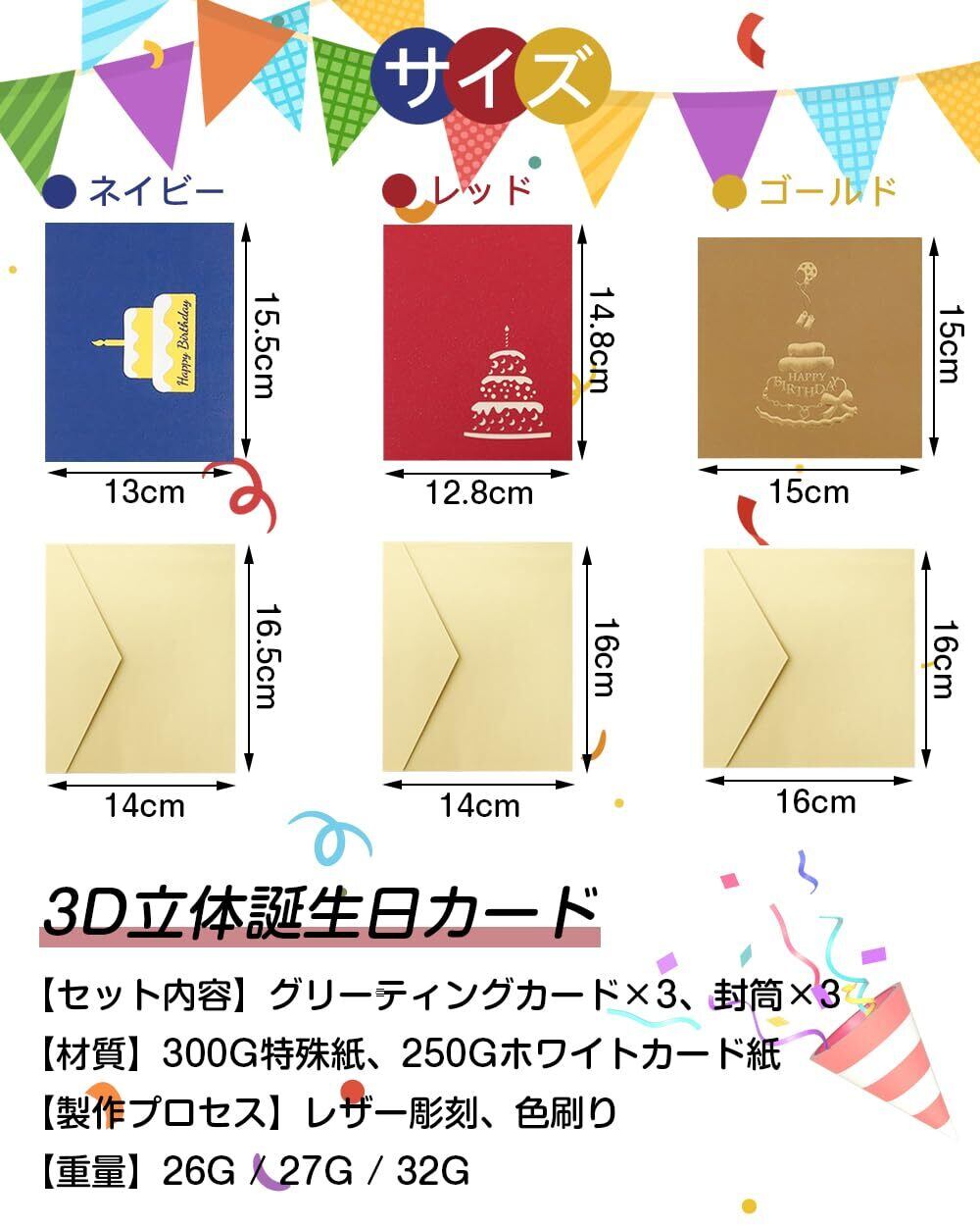 パッケージ内容:グリーティングカード*3(レッド*1、ネイビー*1、ゴールド*1)、封筒*3