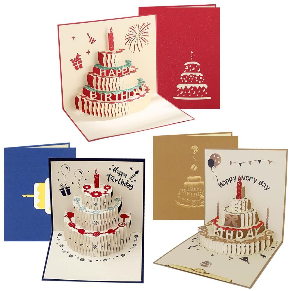 バースデーカード 3枚セット 3D立体 誕生日 メッセージ ポップアップ グリーティング バースデ カード お誕生日 祝い 感謝 封筒付き (タイプE)
