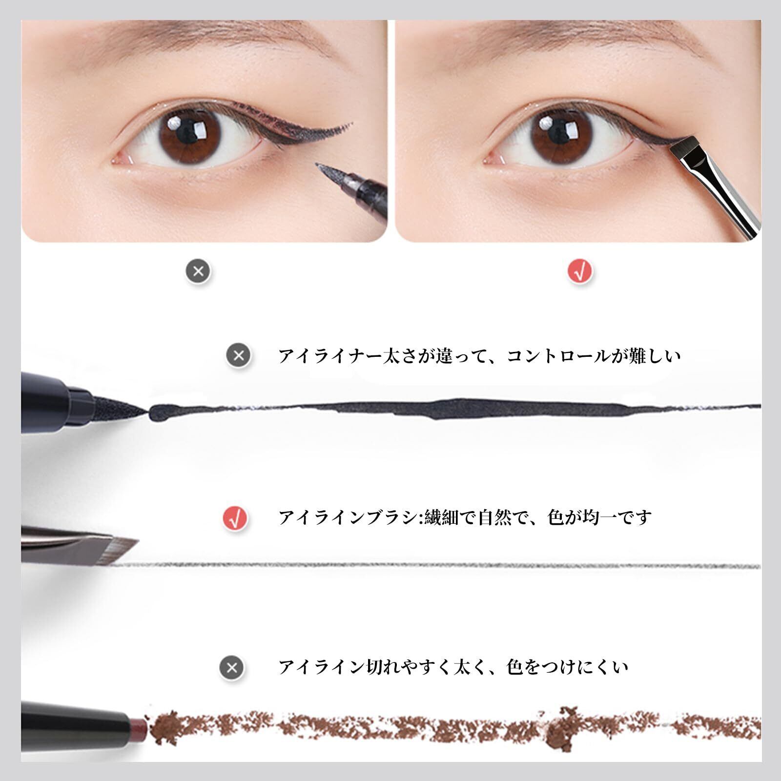 【良質材料】ブラシ毛は柔らかい高品質材料を採用し、感触が温和で、目の前の敏感な肌を刺激しないと同時に、化粧の均一性、良質な材料の使用を確保し、このアイライナーブラシをより長持ちさせ、長時間の使用と洗浄を経ても、元の形状と性能を維持することができる。