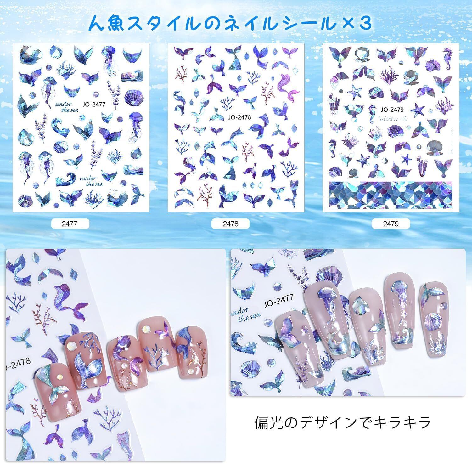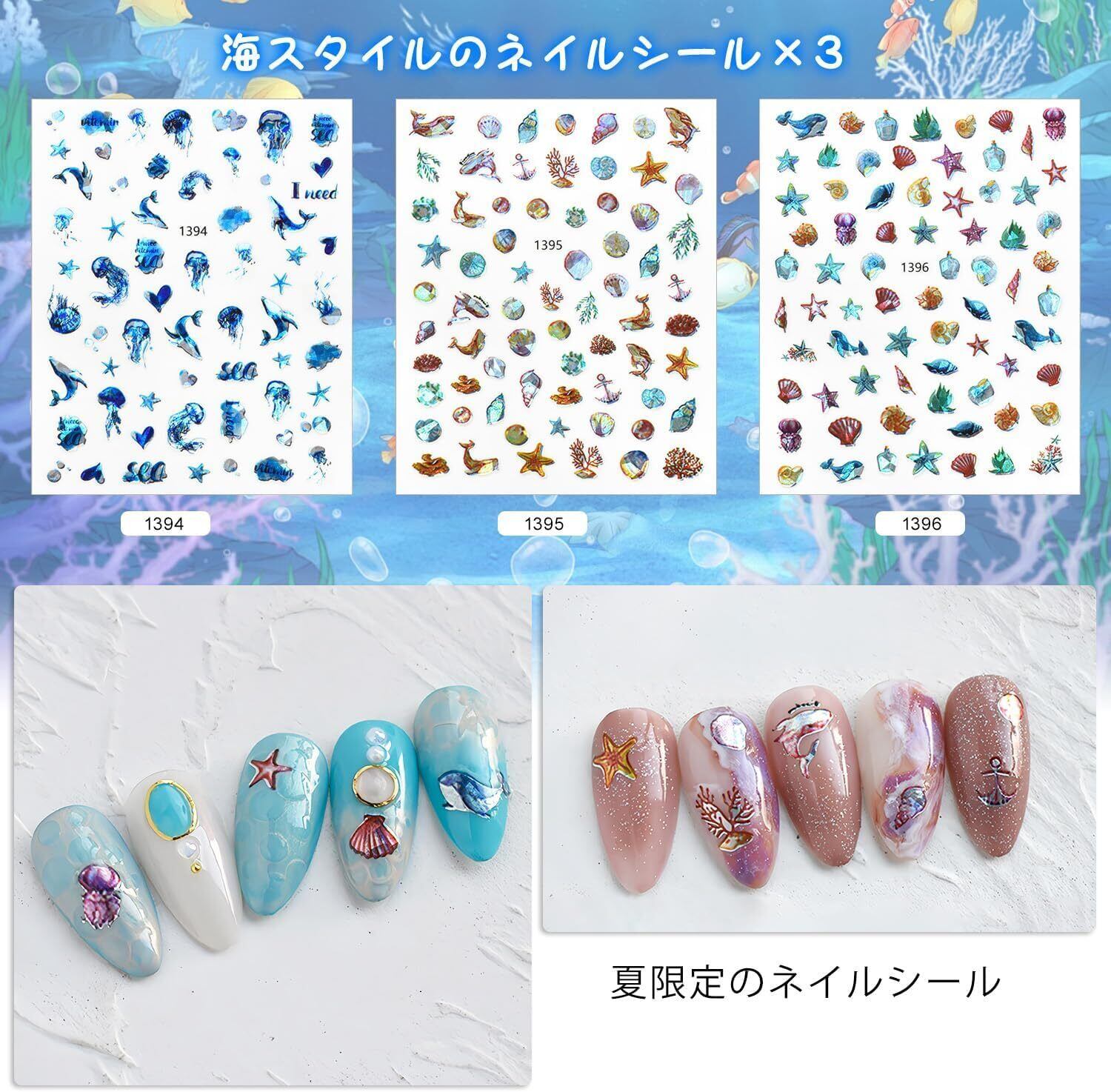 【海ネイルシール】ネイルシール海は、全体のカラーはに青と紫で、貝やクラゲ、人魚など海の生き物の模様が施され、海洋スタイルがいっぱいです