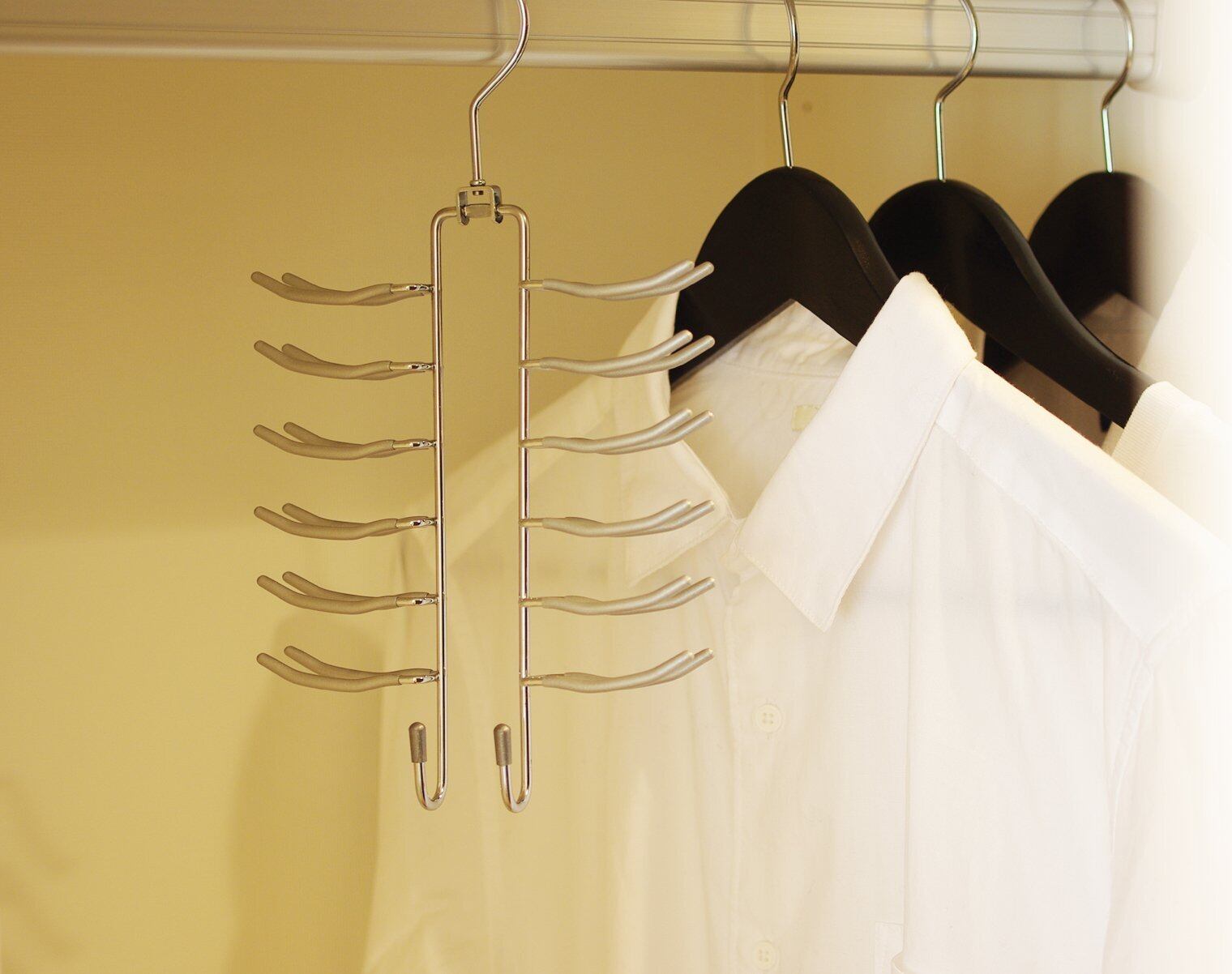 丈夫なスチール本体にポリ塩化ビニル樹脂で特殊加工されていて、ネクタイがすべり落ちにくい。