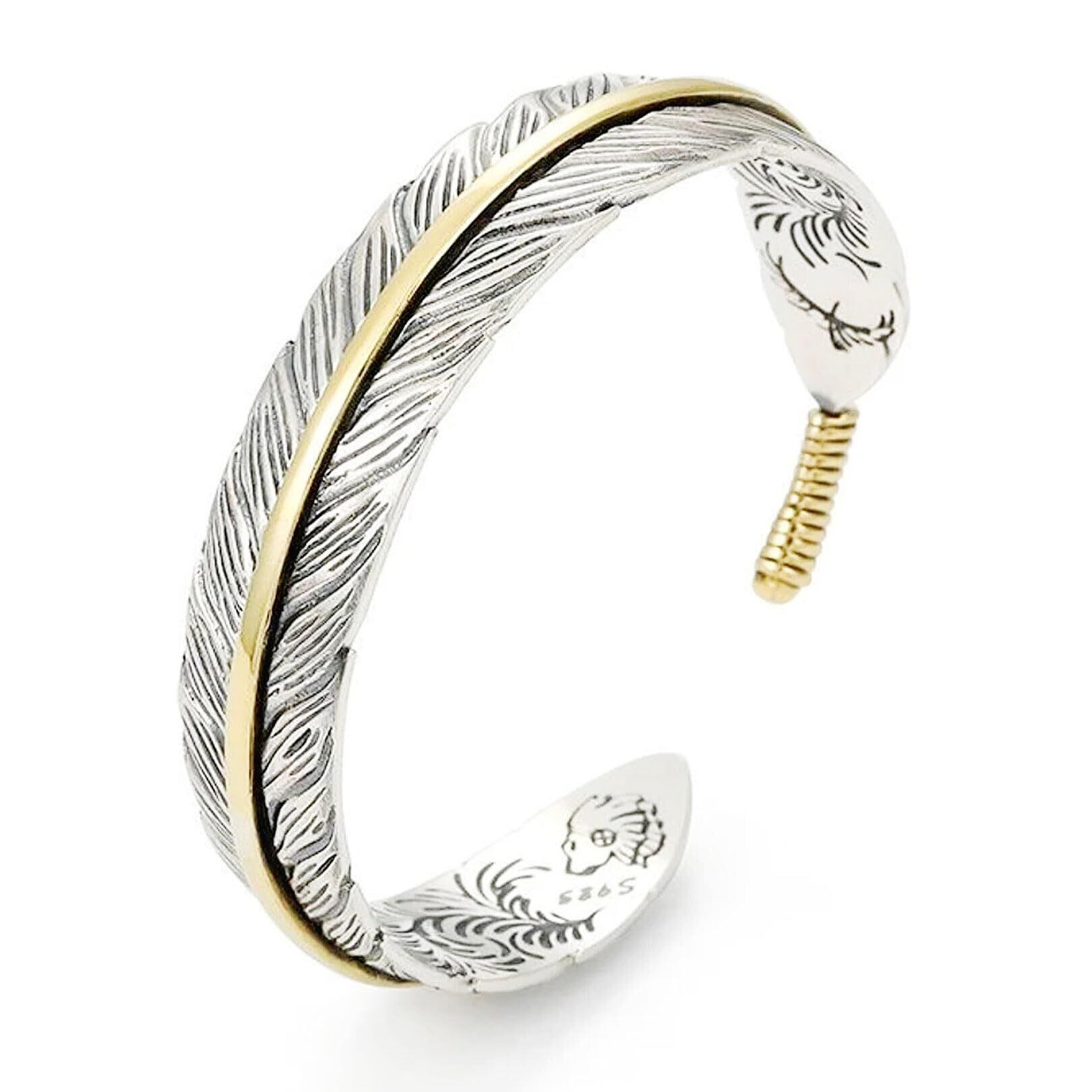 【ゴールド/シルバーの2バリエーション】フェザーバングルのカラーはシンプルなシルバーから、ワンポイントでゴールドのアクセントが映える金と銀の2パターンを揃えています。バングルのサイズ感も少し太めのメンズブレスレットになるので、存在感も抜群!表面の鷲の羽根の形を丁寧にあしらったディテールの細やかさももちろんですが、裏面も全面に子孫繁栄や長寿を意味する唐草模様が刻まれています。見えない所も気を抜かない、丁寧な作りこみもこのメンズアクセサリーの魅力のひとつです。