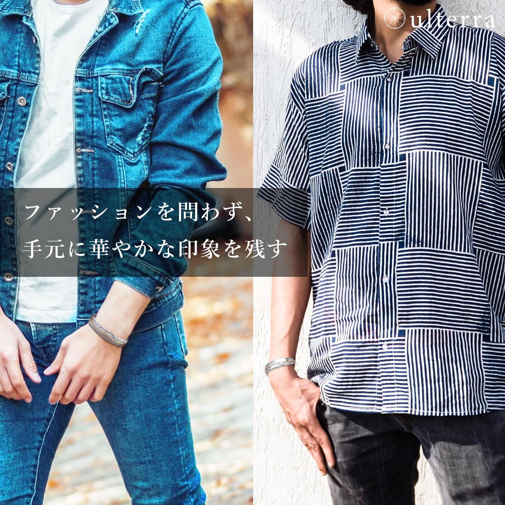 【男らしさをPRするネイティブ系アクセ】シンプル系やハード系などメンズアクセサリーにも様々なスタイルがありますが、男らしいインパクトを狙うならあえてネイティブ系がおすすめ。カジュアルやフォーマル問わずどんなファッションにも合わせやすく、それでいて手首周りに華やかさとインパクトを与えてくれます。特にこの羽根のモチーフのバングルは昔からの定番のアイテムでもあるので、ハードすぎたり、悪目立ちすることなく、コーディネートに自然に溶け込んでくれます。