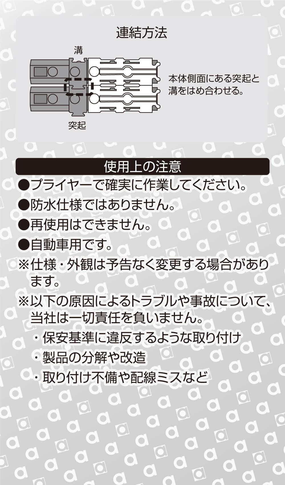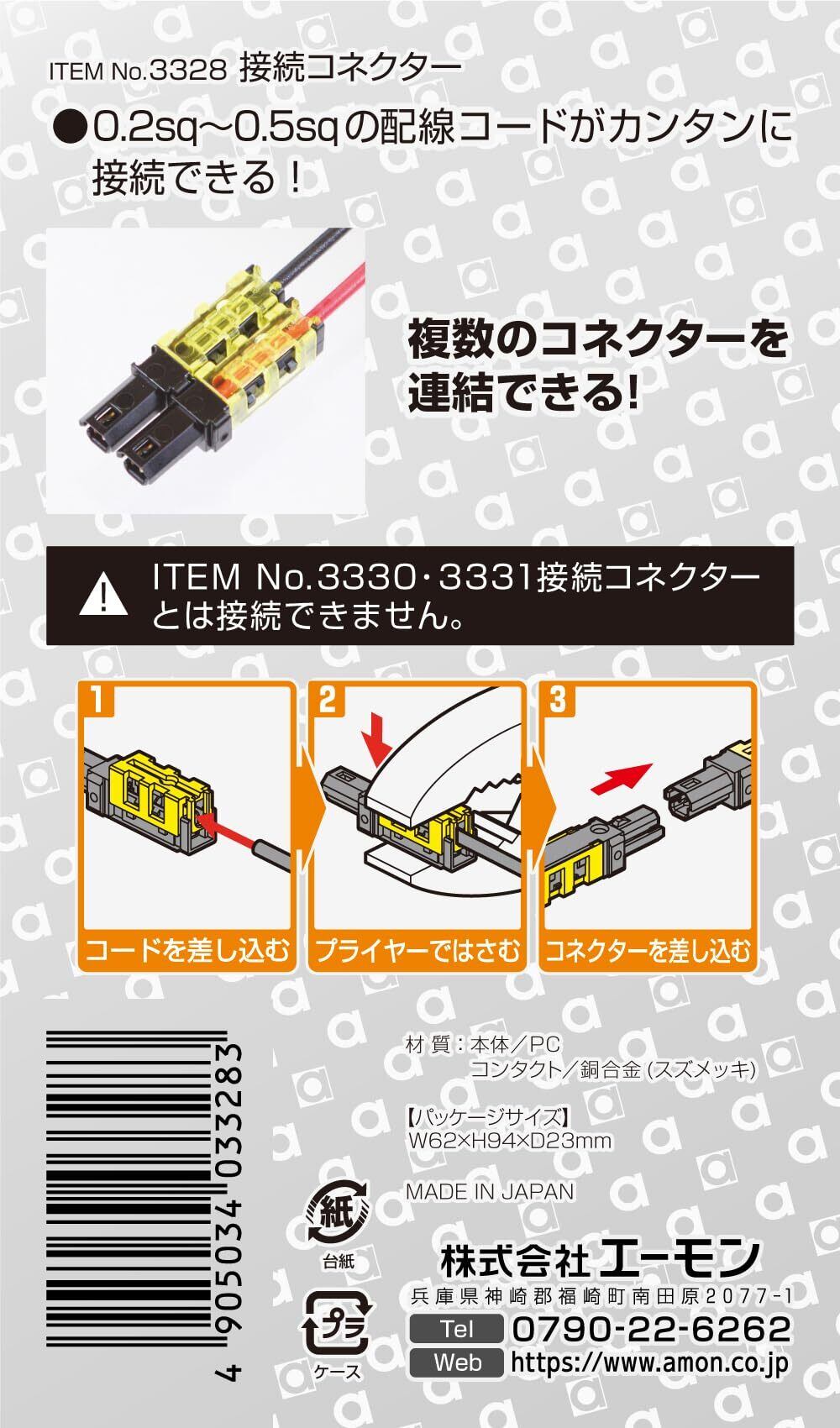 【便利で高性能な接続コネクター】このエーモンの接続コネクターは、AV(S)0.2~0.5sqに対応しており、高い信頼性を誇ります。ギボシ端子の代わりに使える設計で、電気配線の接続をより簡単かつ安全に行うことができます。12個入りで、さまざまな用途に応じてご利用いただけるのが特長です。