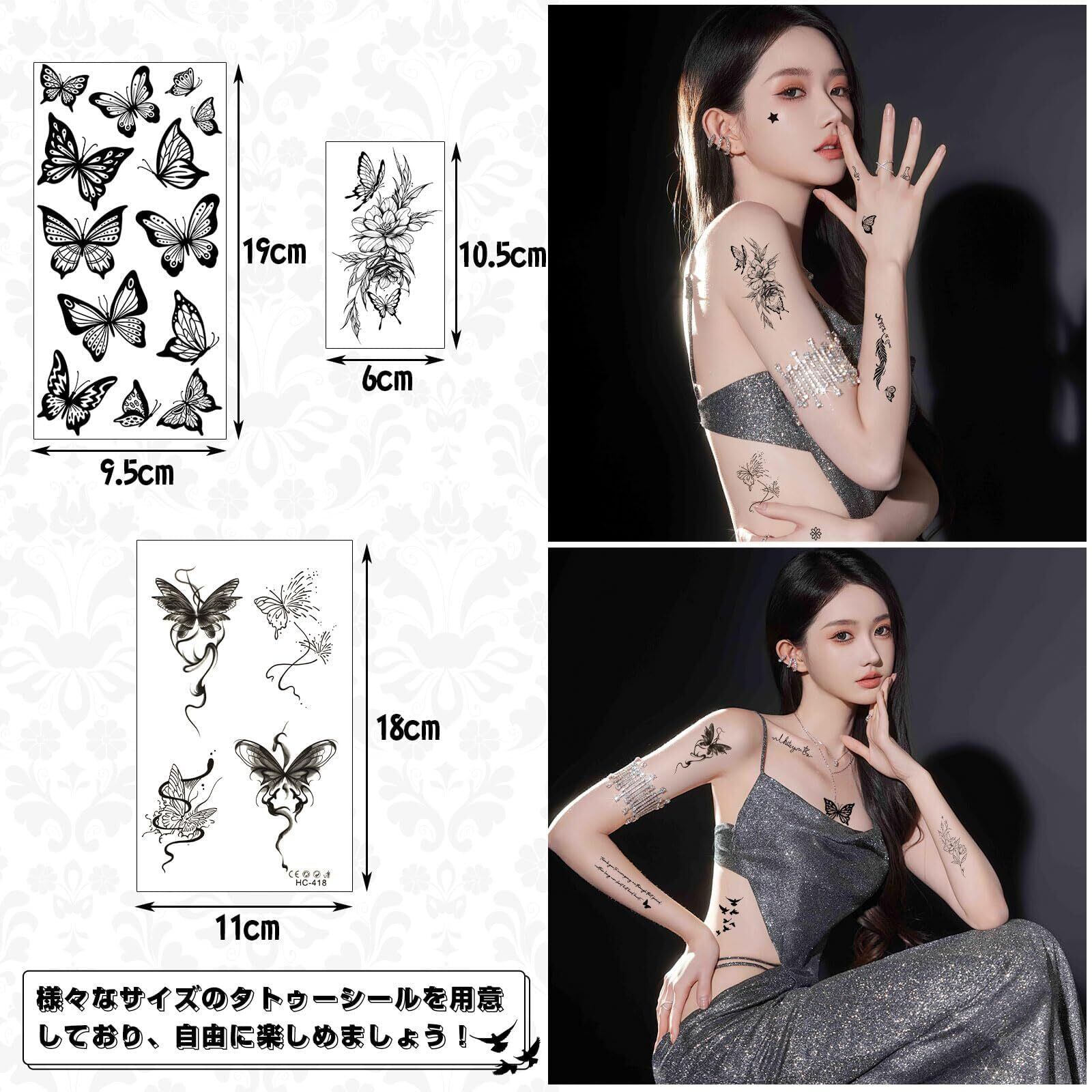 様々なデザイン:蝶々、花、笑顔、文字、猫、笑顔、星、ハート、オーナメント、音符、サソリなど、このタトゥーシールには数十種類のデザインがあります。更に、サイズもたくさん用意しているので、指や手首、足首、胸、デコルテ、耳の後ろ、肩、背中、お腹、腰など、ほとんど部位に対応できます
