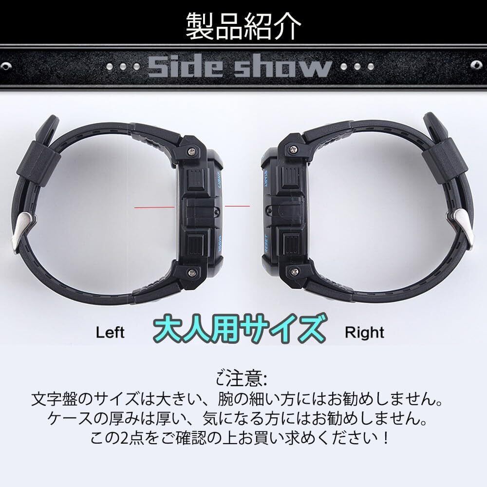 【仕様】ケース直径:約50mm ケース厚み:約17mm バンド長:255mm(約170-235mm調節可能) 本体重さ:約60g 【セット内容】デジタル腕時計+日本語取扱説明書(エコーのため、ボックスなし簡易包装になります。)*月1~2分程度(誤差許容範囲)