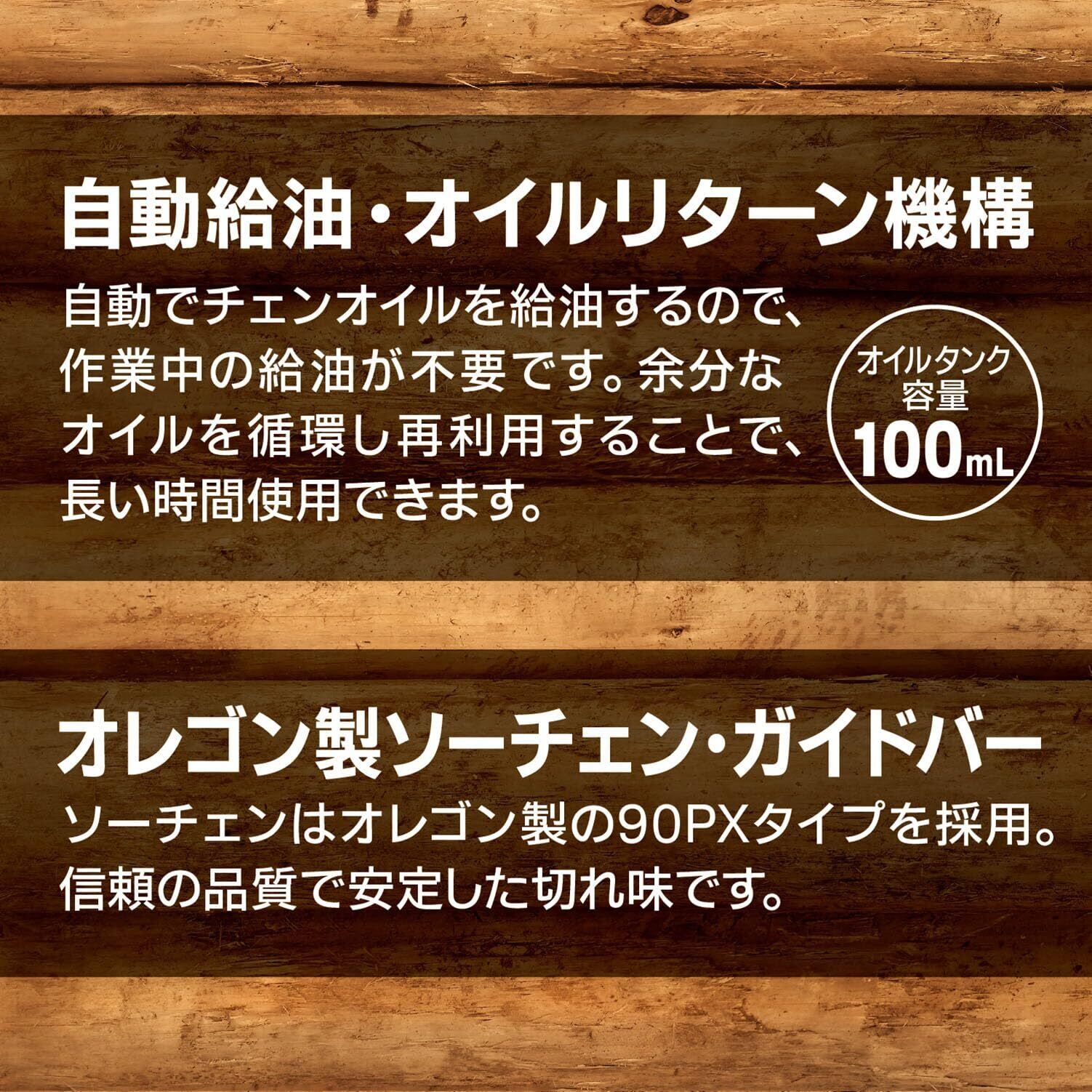付属品:ガイドバー(本体取付)・ソーチェン(本体取付)・チェンカバー(本体取付)・六角棒レンチ5mm(本体収納)