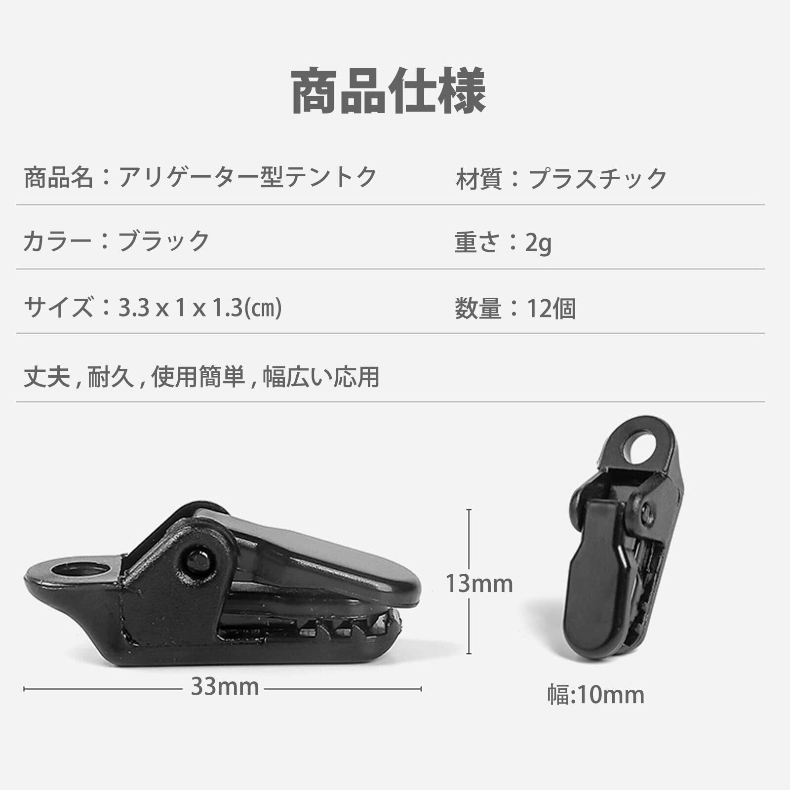 5、【商品仕様】商品名:アリゲーター型テントクリップ;材質:プラスチック;重さ:2g;サイズ:3.3cmx1cmx1.3cm;数量:12