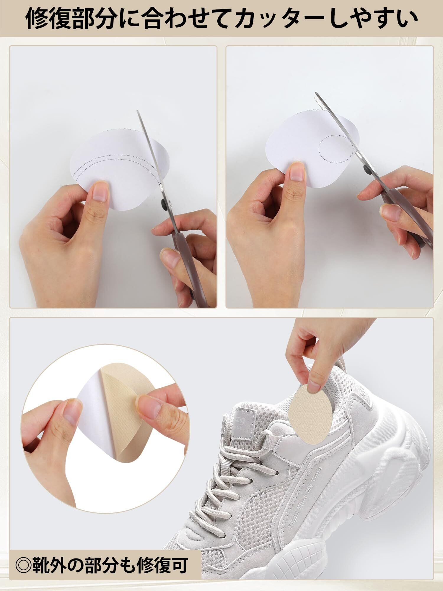【多彩なカラーでおしゃれに演出】: 黒、白、グレー、ベージュの4色が揃っているため、どんな靴にもマッチします。カラーを選ぶことで、おしゃれな見た目を維持しながら補修ができるのが嬉しいポイント。パッチを使用することで、デザインのアクセントにもなり、靴のおしゃれ度をアップさせます!