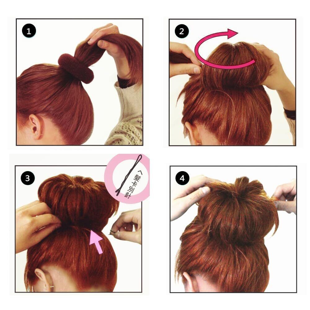 1.髪を束ねて、お団子ヘアピンを髪の中心に置きます。 2.髪をヘアピンに巻き付け、お団子を作ります。 3.ヘアピンをしっかりと固定し、必要に応じてヘアピンを調整します。 4.ヘアスタイルを整えて完成です。
