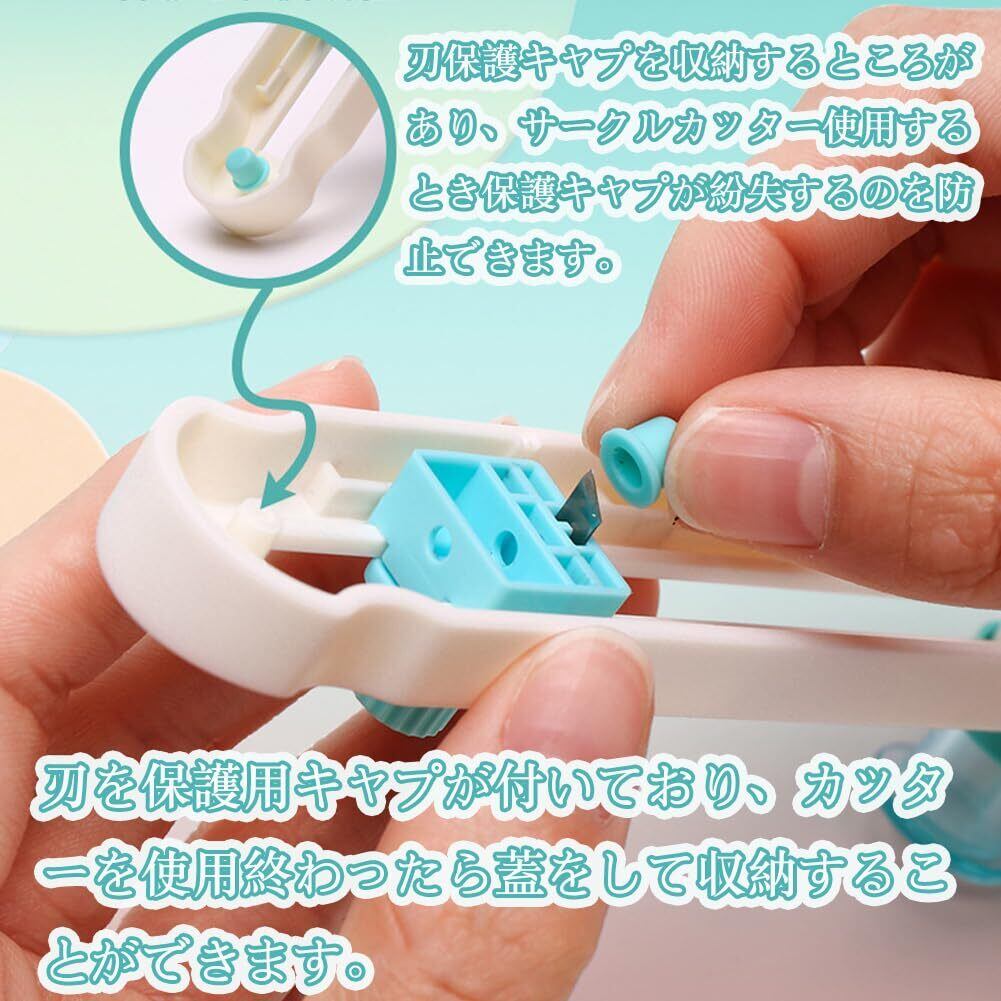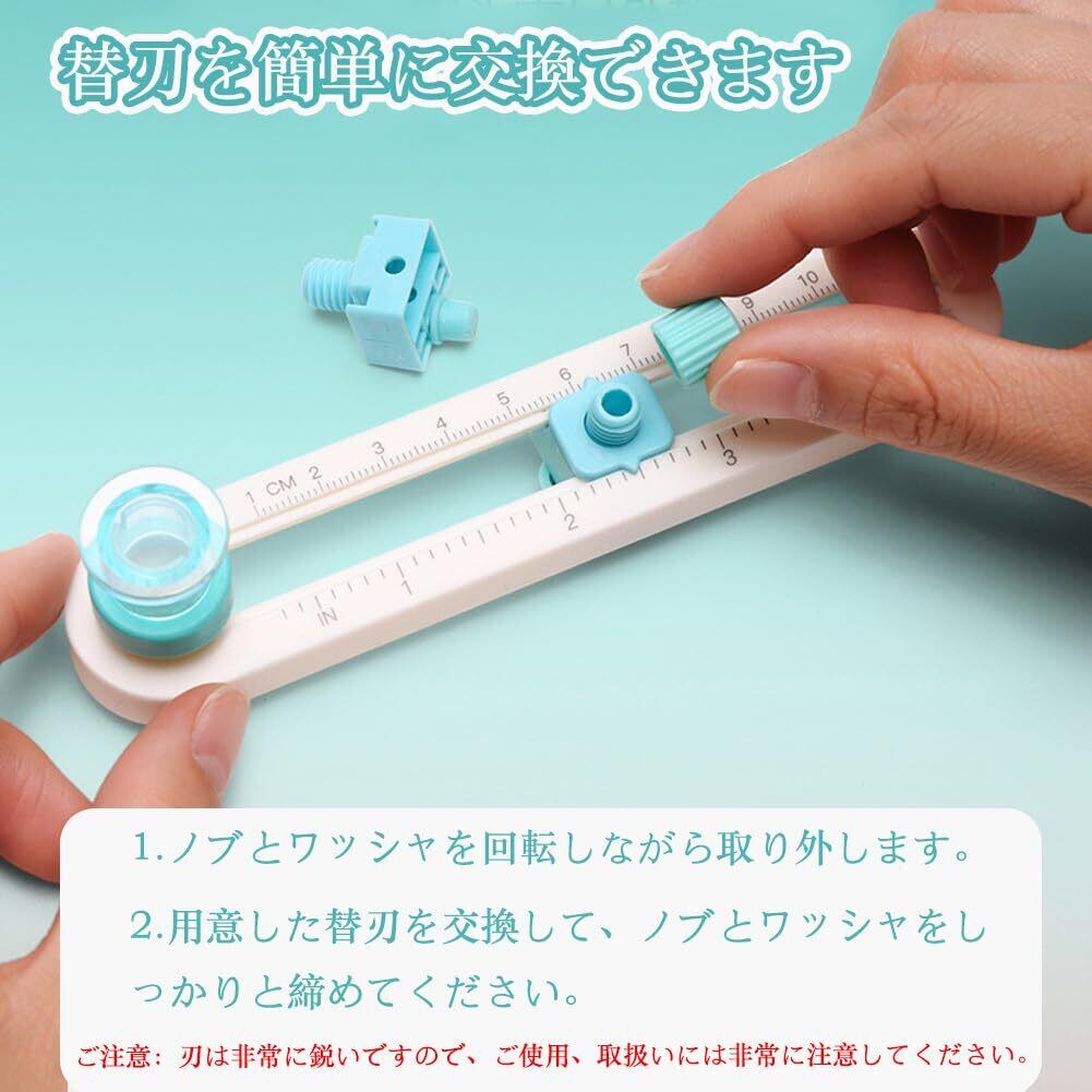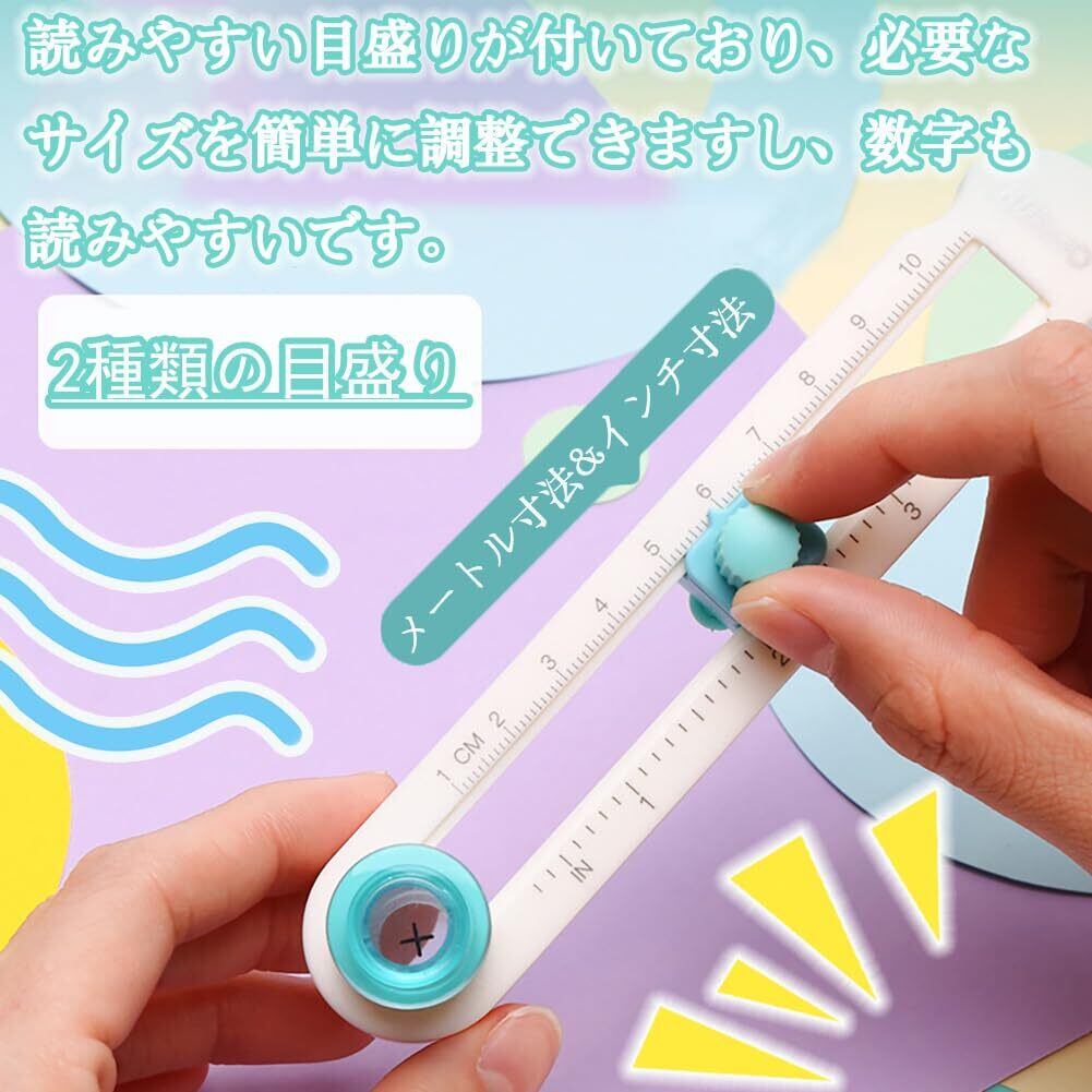 使いやすい:刃が鋭くて使いやすいです。スムーズに操作することができます、きれいな円を簡単に切ることができます。さらに、円切りカッターには読みやすい目盛りが付いており、必要なサイズを簡単に調整できますし、数字も読みやすいです。子供でも気軽に使えます。ハンドメイドレッスンでの使用に最適。(円切りカッターに付いた目盛りは半径です。ご注意ください。)使い方:①切りたい円の直径サイズにノブを合わせる。②保護キャップを取り外す。③青い円筒の部分を力強く押さえながら切ります。