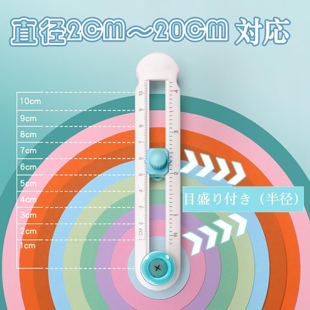 【簡単に丸切りができる円形カッター!】: この「円形カッター」は、紙や薄い素材を手軽に丸くカットするための便利なアイテムです。直径2cmから20cmまで対応し、様々なサイズに簡単に調整できるので、手作りの作品が楽しくなります。目盛り付きで、精密なカットが可能です。