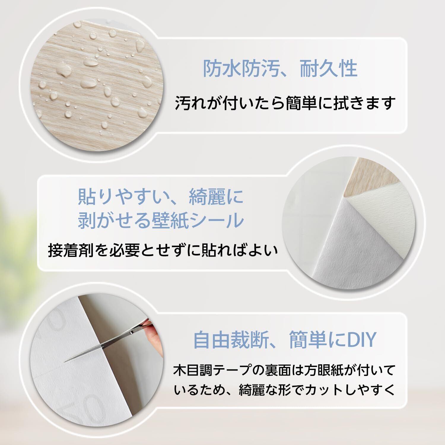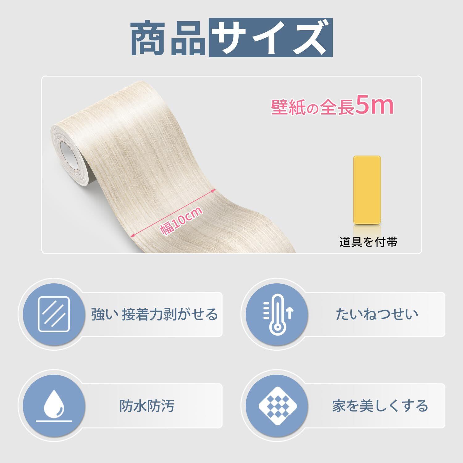 【貼りやすい剥がせる壁紙シール】木目調テープの裏面に粘着剤が付いており、そのまま貼り付けられる。貼ってはがせる木目シートですが、しわや破れなどになりにくいタイプで、キレイに貼れます。10cmの幅で、初心者一人でも簡単で仕上がります、賃貸でも安心にご利用いただけます。