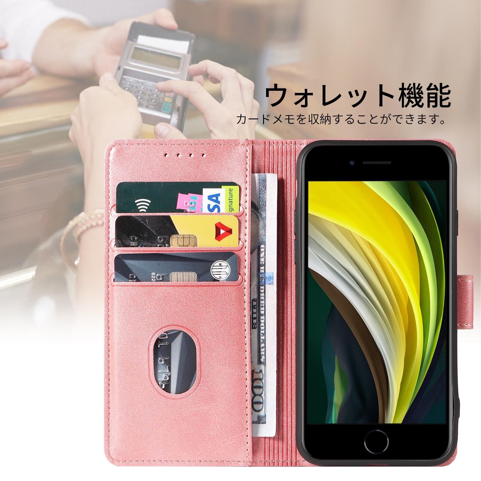 【新着商品】iPhone SE ケース 手帳型 第2世代 第3世代 スマホケース iPhone 8 7 携帯カバー レザー 軽量 薄型 耐衝撃 耐摩擦 全面保護 マグネット式 カード収納 スタンド機能 4.7インチ対応(バラゴールド, iPhone8 iPhone7 iPhone SE2 iPhone SE3)