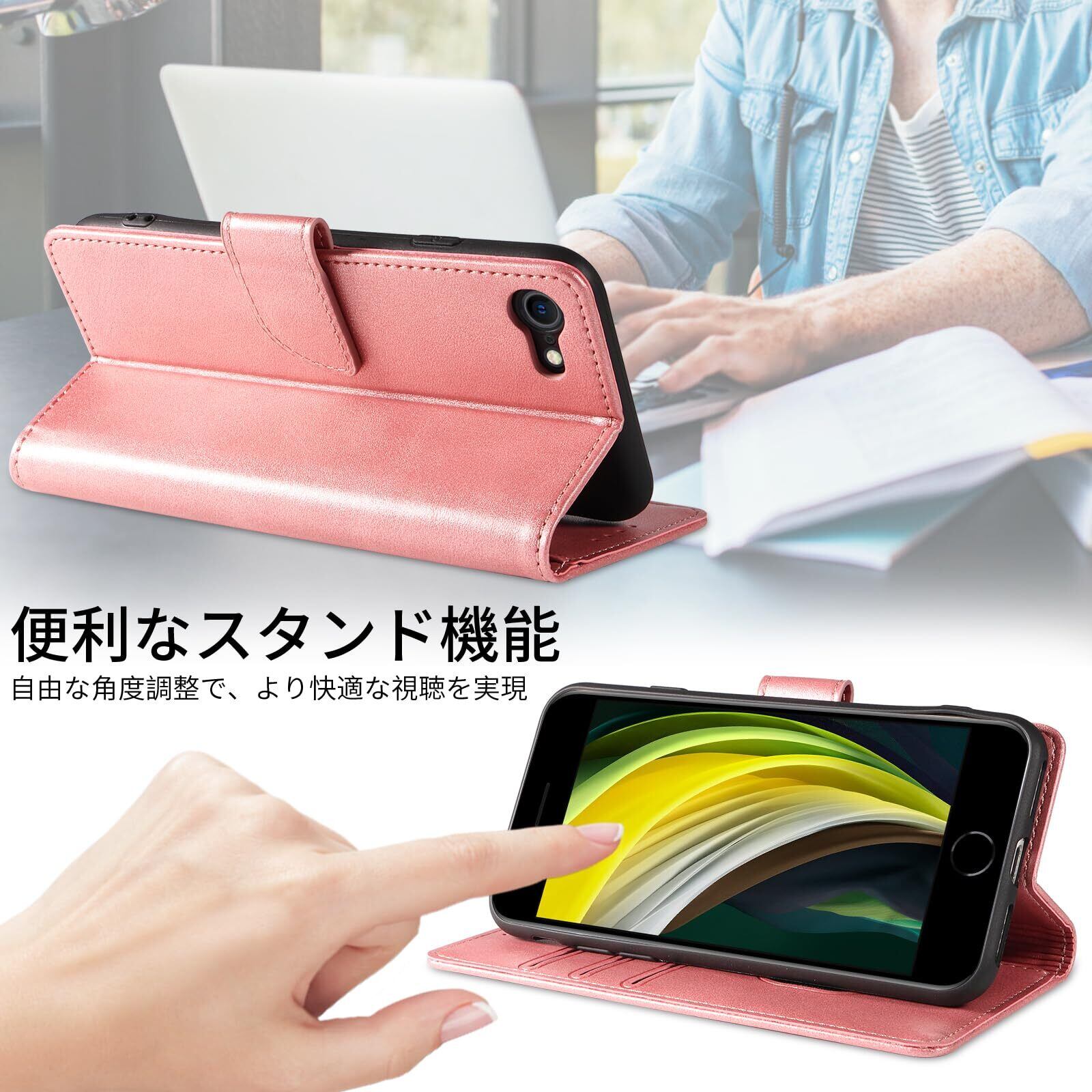 iPhone SE ケース 手帳型 第2世代 第3世代 スマホケース iPhone 8 7 携帯カバー レザー 軽量 薄型 耐衝撃 耐摩擦 全面保護 マグネット式 カード収納 スタンド機能 4.7インチ対応(バラゴールド, iPhone8 iPhone7 iPhone SE2 iPhone SE3)