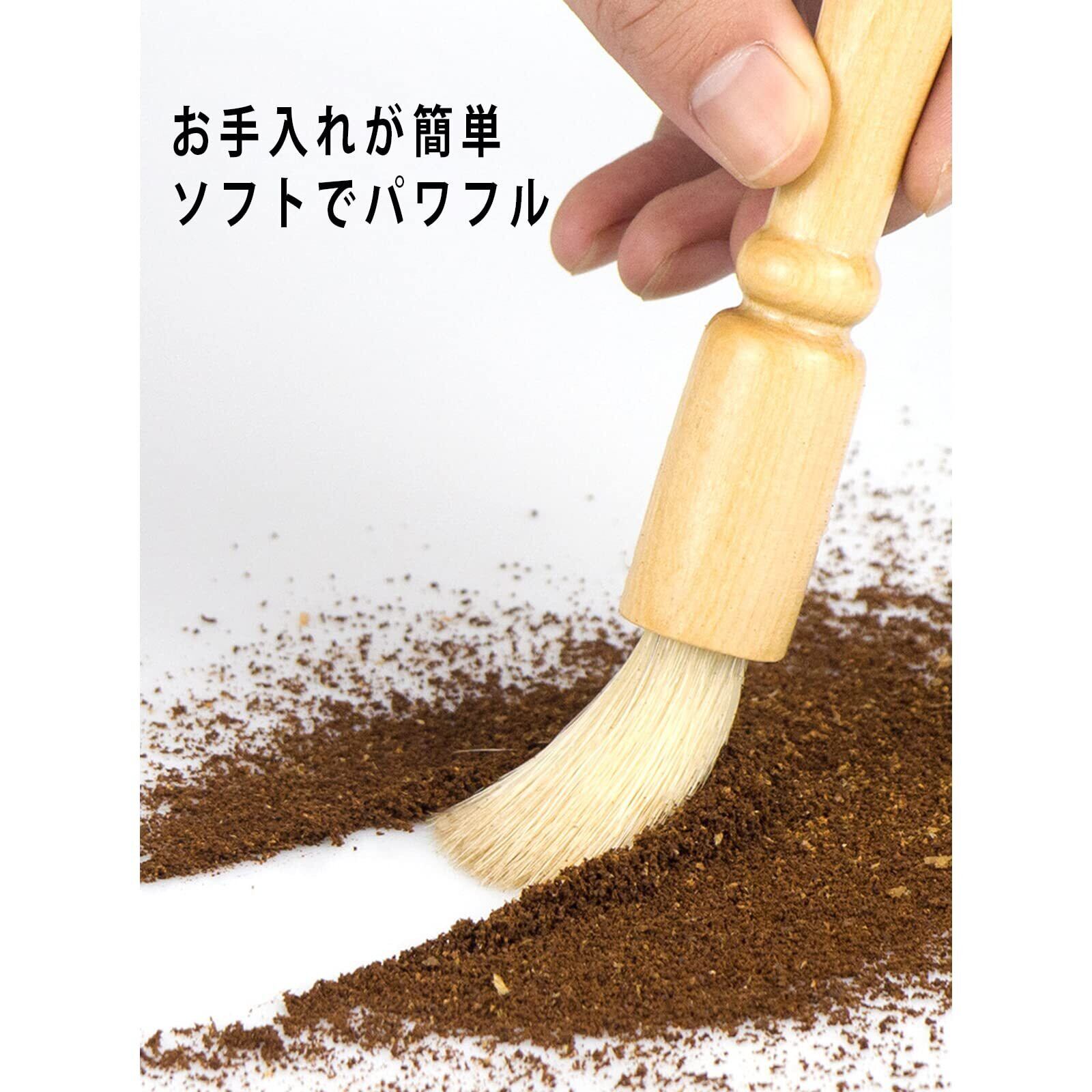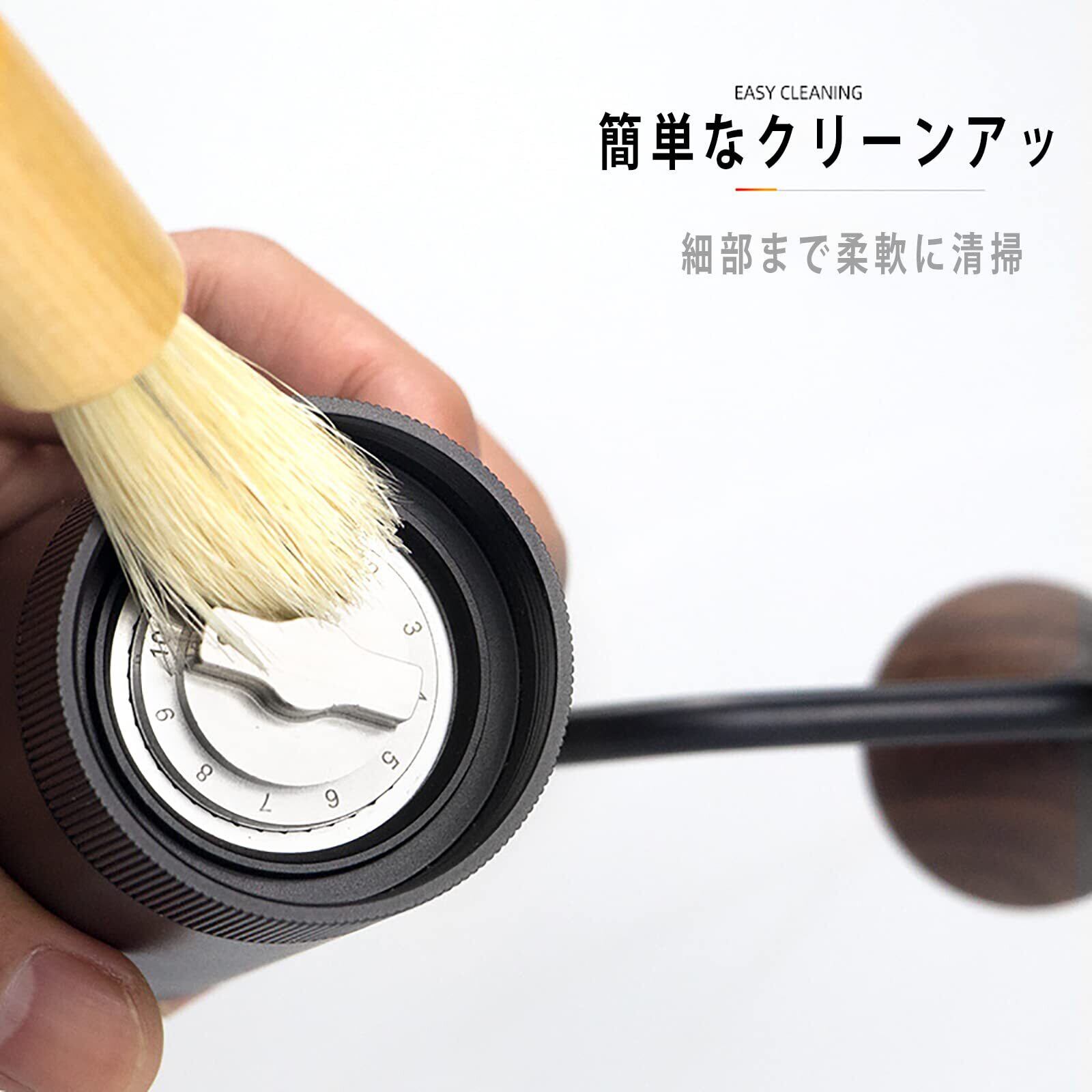 【便利なコーヒーミル用クリーニングブラシ!】: このコーヒーミル専用のクリーニングブラシは、木製のハンドルと柔らかいブラシ部分で構成されています。コーヒーの粉を簡単に除去でき、いつでも清潔にお使いいただける便利なアイテムです。
