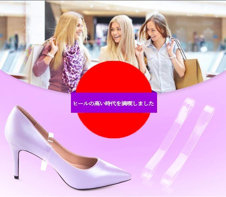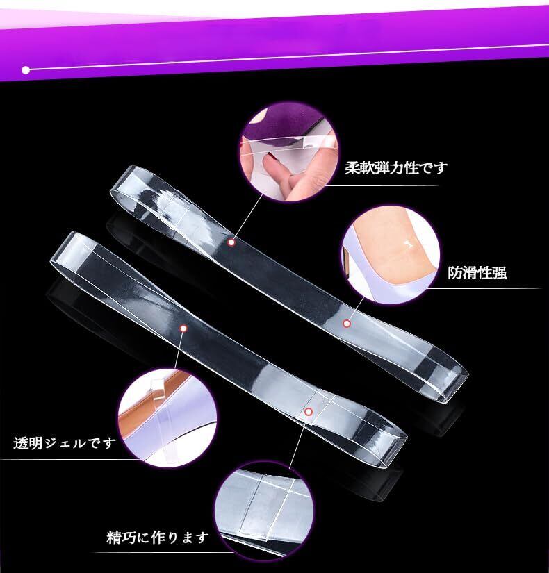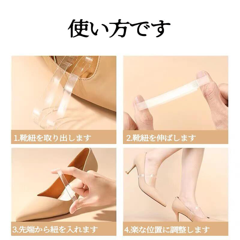 【広く用途】様々なタイプの靴に使用可能!素材は肌ととても合って、透明で目立ちにくいデザインなので、ハイヒールやパンプス、サンダルミュールなど色、デザイン問わず様々な靴でご利用いただけるストラップです。長時間着用しても違和感はありません。