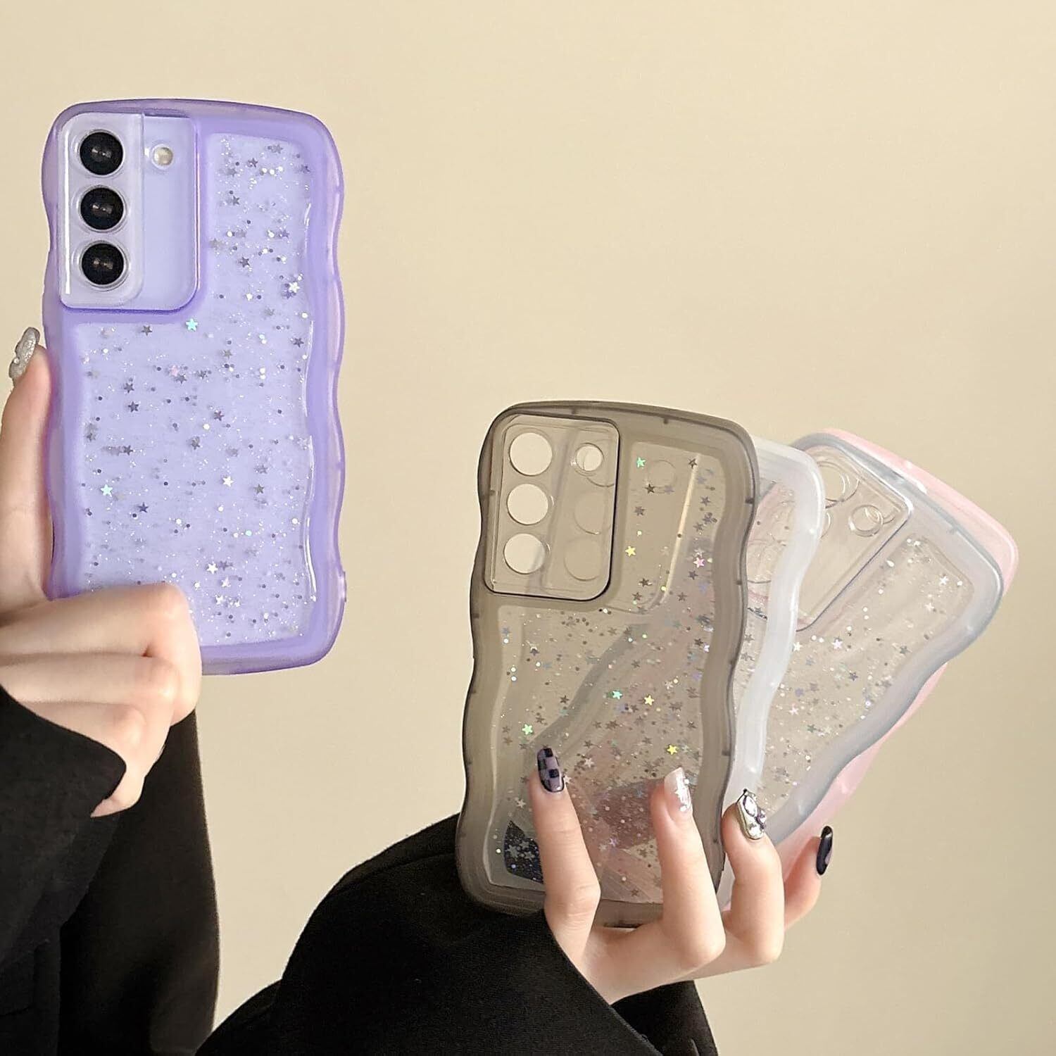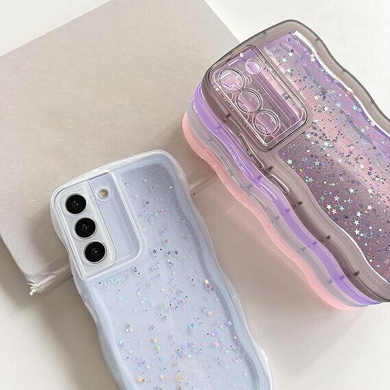 【透明感 ▪ フィット感】背面は透明度ポリカーボネートの素材で、Galaxy S21本来の美しさと高級感をそのままに映り出し、埋め込まれている目を引くグリッターが剥がれ落ちたりしなく、あなたの携帯電話は、より美しさとファッションに見えるようにします。サイド周りのウェーブ部分は柔らかな素材のTPU素材で、デザインが手にフィットして持ちやすく、可愛い、流行りの韓国デザインです!