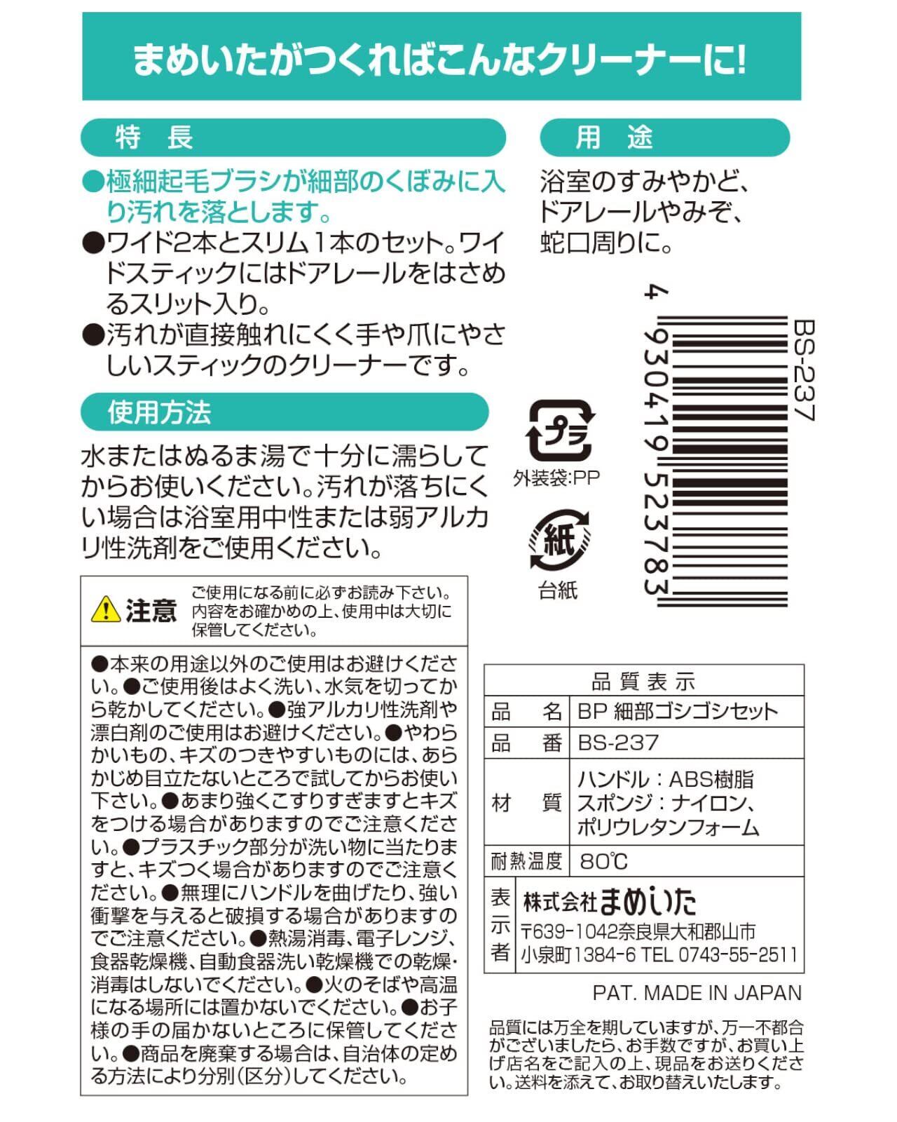 【お掃除を楽しくする便利なブラシセット!】: 「まめいた 細部ゴシゴシ ブラシ セット」は、浴室やキッチンなどの細かい部分をしっかりと掃除できるアイテムです。日本製の高品質なブラシで、快適なお掃除をサポートします。