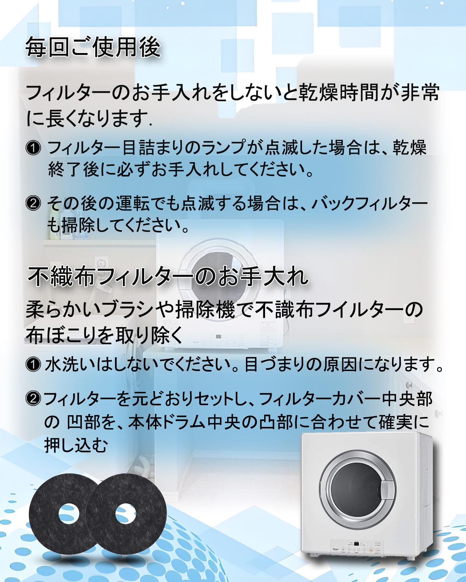パナソニック衣類乾燥機の性能低下が気になりますか?❶衣類乾燥機の乾燥時間が長い❷乾燥運転中にエラー頻発❸乾燥機掃除の手間のは面倒❹フィルターに粉状のホコリがいっぱい付着など、フィルターが目詰まりすると乾燥ムラ・乾燥時間の増加・電気代アップの原因に。...、古いフィルターを取り外して、新しいフィルターを入れれば、素早く交換でき、乾燥機のパワーを十分に引き出し、省エネ効果にも繋がります。