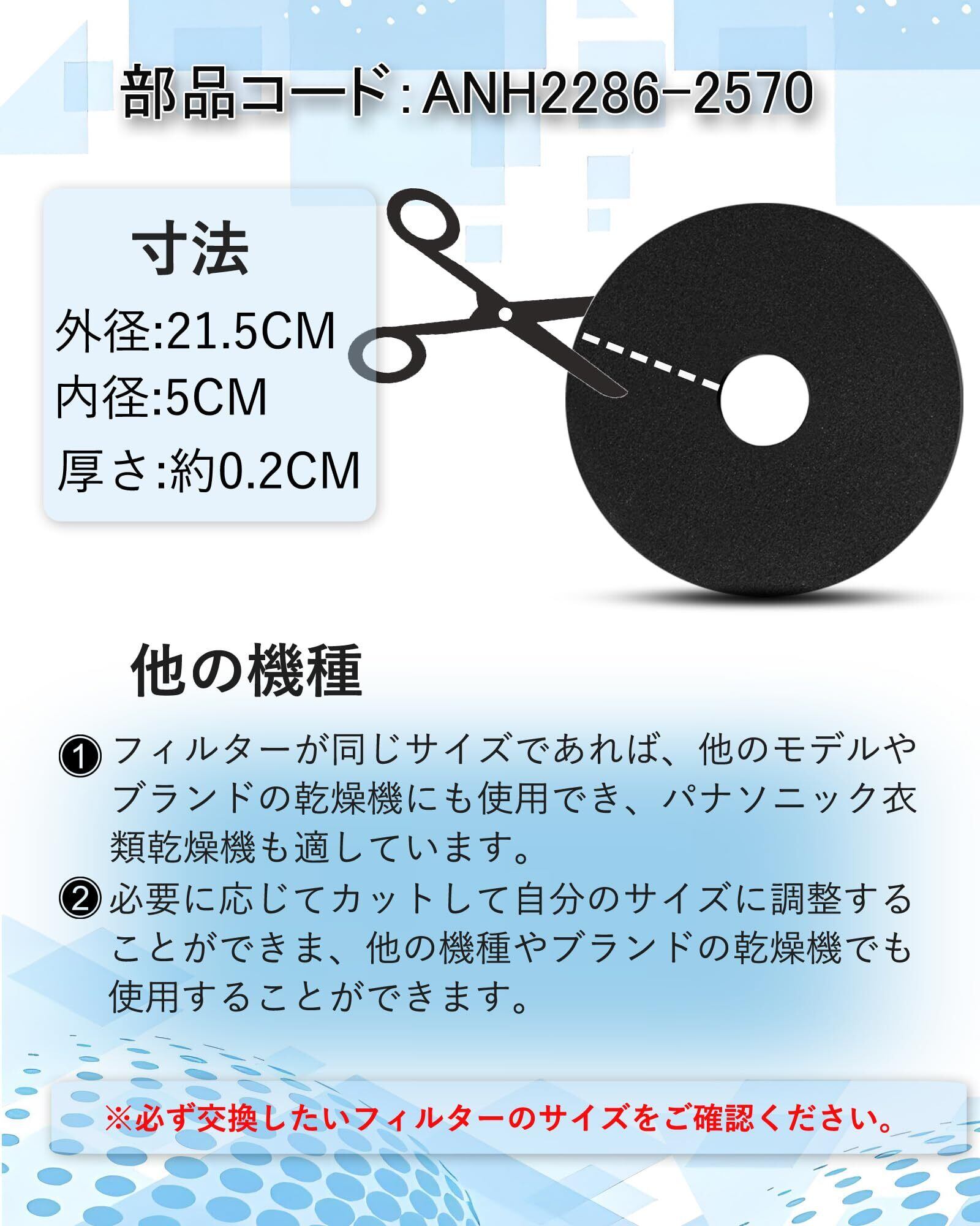 【商品仕様】パナソニック乾燥機用フィルター×4枚/8枚入①対応機種番号:ANH2286-2570、②材質:通気性・吸水性に優れる不織布、③ サイズ:外径約21.5cm、内径:5cm、④長期間使用できる経済的なパナソニック乾燥機フィルターで、不織布素材は軽くて扱いやすく、目詰まりしにくいため、持続可能でお財布にも優しい交換用フィルターです。