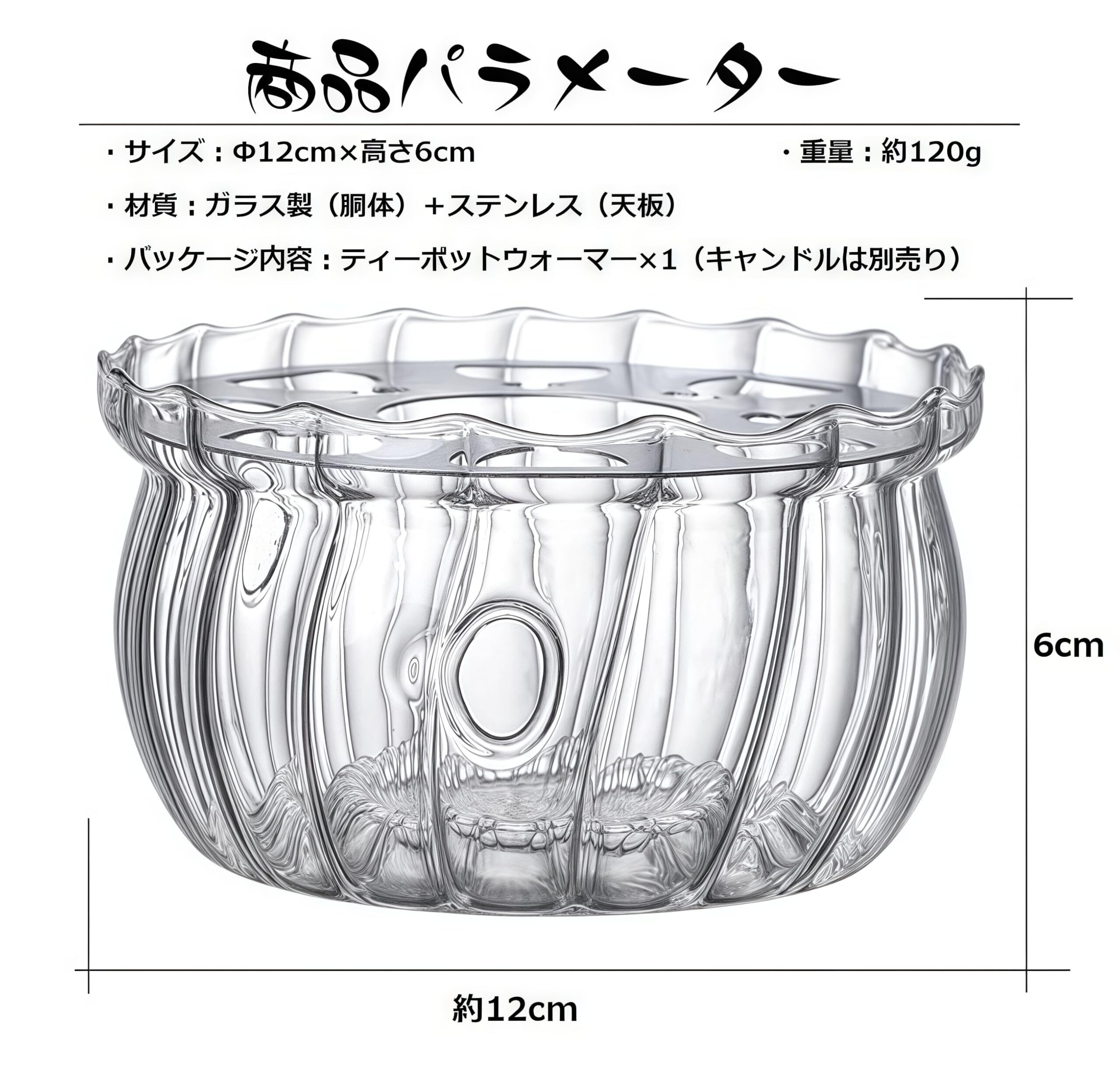 <サイズ>Φ12cm×高さ6cm;<重さ>約120g;<素材>耐熱ガラス+ステンレス;<色>透明;※底面がΦ6cm~14.5cmのティーポットに対応しています。