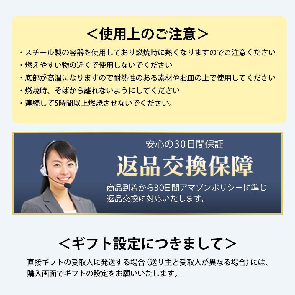 <使用上のご注意> スチール缶を使用しており燃焼時に熱くなります。付属のシリコンマットをご使用いただくか、耐熱性のある素材やお皿の上で使用してください。