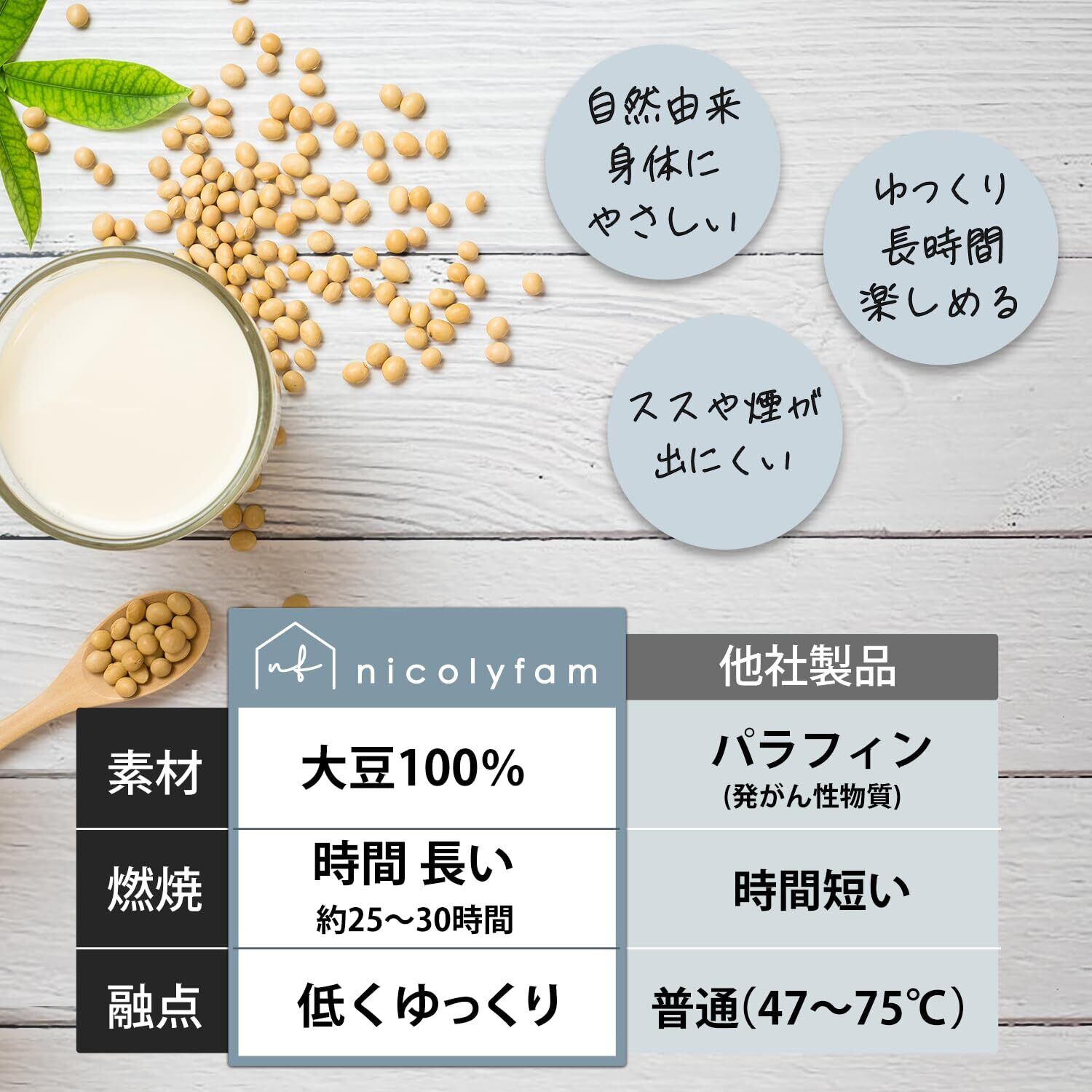 【自宅で手軽にリラクゼーション!】: 「【nicolyfam】 アロマキャンドル 詰め合わせ セット」は、ソイワックスを使用した自然由来のキャンドルで、心地よい香りが心を癒やします。バニラ、ラベンダー、ローズの3つの香りが揃い、毎日の疲れをリフレッシュするのにぴったりです。