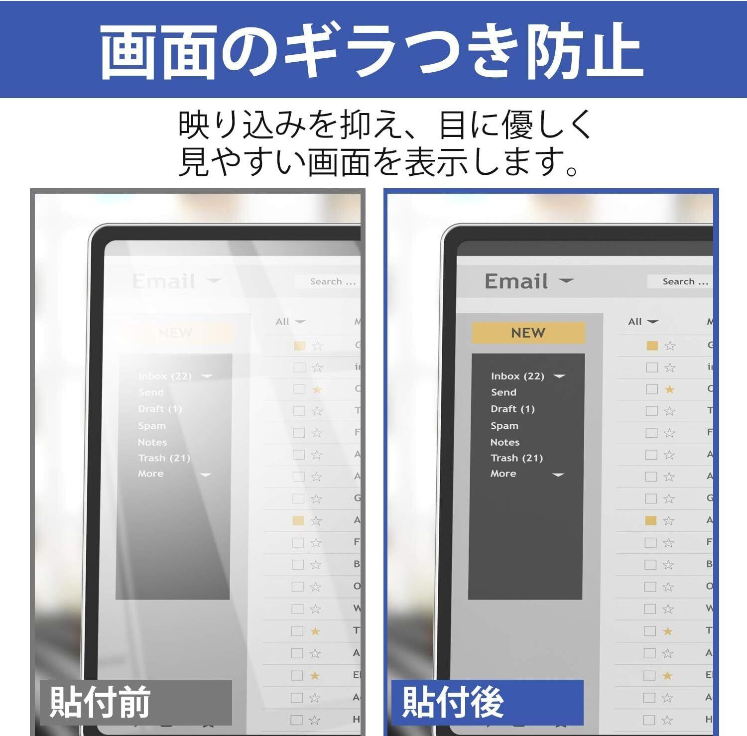 【超反射防止】:ライトの反射や映り込みを低減し、ギラつきが無くなり画面が見やすくなります。 【気泡ゼロ】:特殊なシリコン吸着素材を採用。指やカードで簡単に押し出すことができます。貼り付け失敗した場合でも、はがして貼り直しが可能です。※ホコリが立ちにくい場所で拭き取りシート、クロス、ホコリ除去シールを使用し、ホコリを完全に除去してから貼り付けてください。