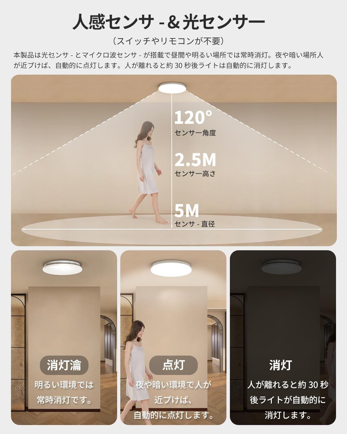 【人感センサ- & 光センサ一】-(スイッチやリモコンが不要)①本製品は光乜ンサ-とマイクロ波センサ-が搭載で昼間や明るい場所 では常時消灯。夜や暗い場所人が近プけば、自動的に点灯しま す。人が離れると約30秒後ライトは自動的に消灯します。②センサ一角度:120°/センサ-直径:5M/センサ一高さ:2.5M。③消灯瀹:明るい環境では。/常時消灯です。/点灯:夜や暗い環境で人が 、近プけば、自動的に点灯します。/消灯:人が離れると約30秒、後ライトが自動的に消灯します。