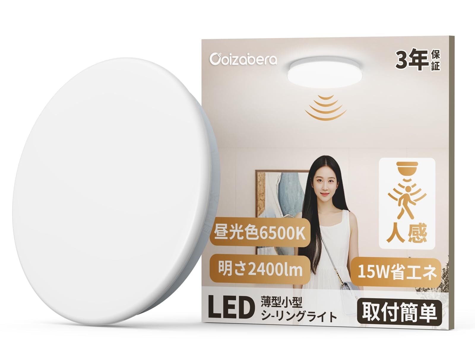 小型シーリングライト 人感センサー 15W 節電 玄関照明 2400lm 昼光色6500K LED ワンタッチ取付 コンパクト 3畳 4畳 4.5畳 6畳 天井照明 おしゃれ ledライト 蛍光灯 廊下照明/寝室/玄関/薄型 トイレライト 洗面所 クローゼット トイレ、階段、台所 工事不要
