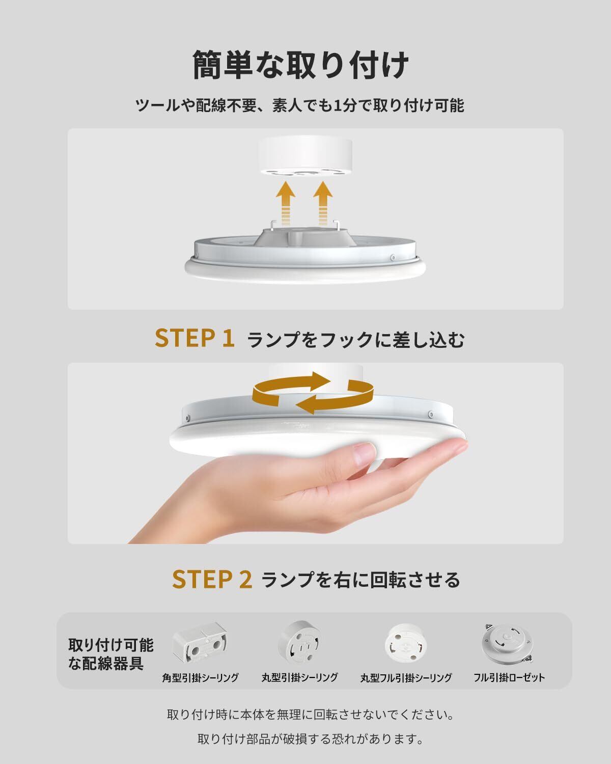 【ワンタッチ取付で簡単設置!】: 工事不要で、ワンタッチで簡単に取り付けることができるので、初心者でも安心です。サイズは3畳から6畳のスペースに最適で、どんなお部屋にもマッチします。気軽にデコレーションしながら、快適なライティングを手に入れましょう!